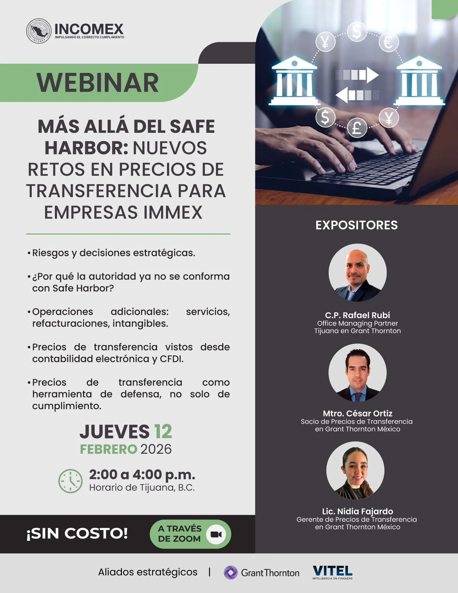 Se explicarán estrategias para el cumplimiento en materia Precios de Transferencia. Contaremos con la participación de los especialistas de Grant Thornton: Rafael Rubí, office managing partner Tijuana, César Ortiz, socio de Precios de Transferencia y Nidia Fajardo, gerente de Precios de Transferencia.